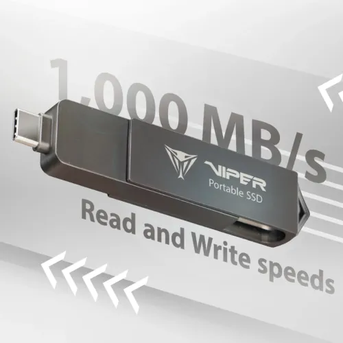 The Patriot VIPER PVP30 1TB Portable SSD is a premium high-speed external storage solution designed for professionals, gamers, and content creators who demand performance and reliability. Featuring a USB 3.2 Gen 2 interface, the Patriot PVP30 1TB Type-C Portable SSD supports both USB Type-C and Type-A connections, making it universally compatible with modern laptops, desktops, gaming consoles, and Mac devices. With sequential read and write speeds of up to 1000 MB/s, this SSD ensures ultra-fast data transfers, quick system backups, and lag-free 4K or even 8K video editing, perfect for workflows that require maximum efficiency. The Patriot PVP30 1TB Portable SSD is built with a PCIe M.2 controller integrated with a USB 3.2 bridge on a single chip, delivering exceptional performance in a compact and durable design. It uses a high-efficiency zinc alloy housing that provides excellent heat dissipation, maintaining stability during long hours of heavy workloads. The device measures only 3.23” x 0.67” x 0.39” and weighs just 31.5 g, making it highly portable without compromising durability. The Patriot VIPER PVP30 1TB Portable SSD is an excellent alternative for professional video editors, gamers, and anybody who needs dependable high-speed storage. It supports Apple ProRes and is compatible with numerous operating systems, including Windows 11, 10, 8.1, 7, Vista, XP, and Mac OS 10.3 or later. It runs between 0°C and 70°C and can sustain storage temperatures ranging from -25°C to 85°C, ensuring longevity in harsh situations. Whether you require lightning-fast performance for gaming, content production, or regular use, the Patriot VIPER PVP30 1TB Portable SSD provides unmatched mobility and stability.